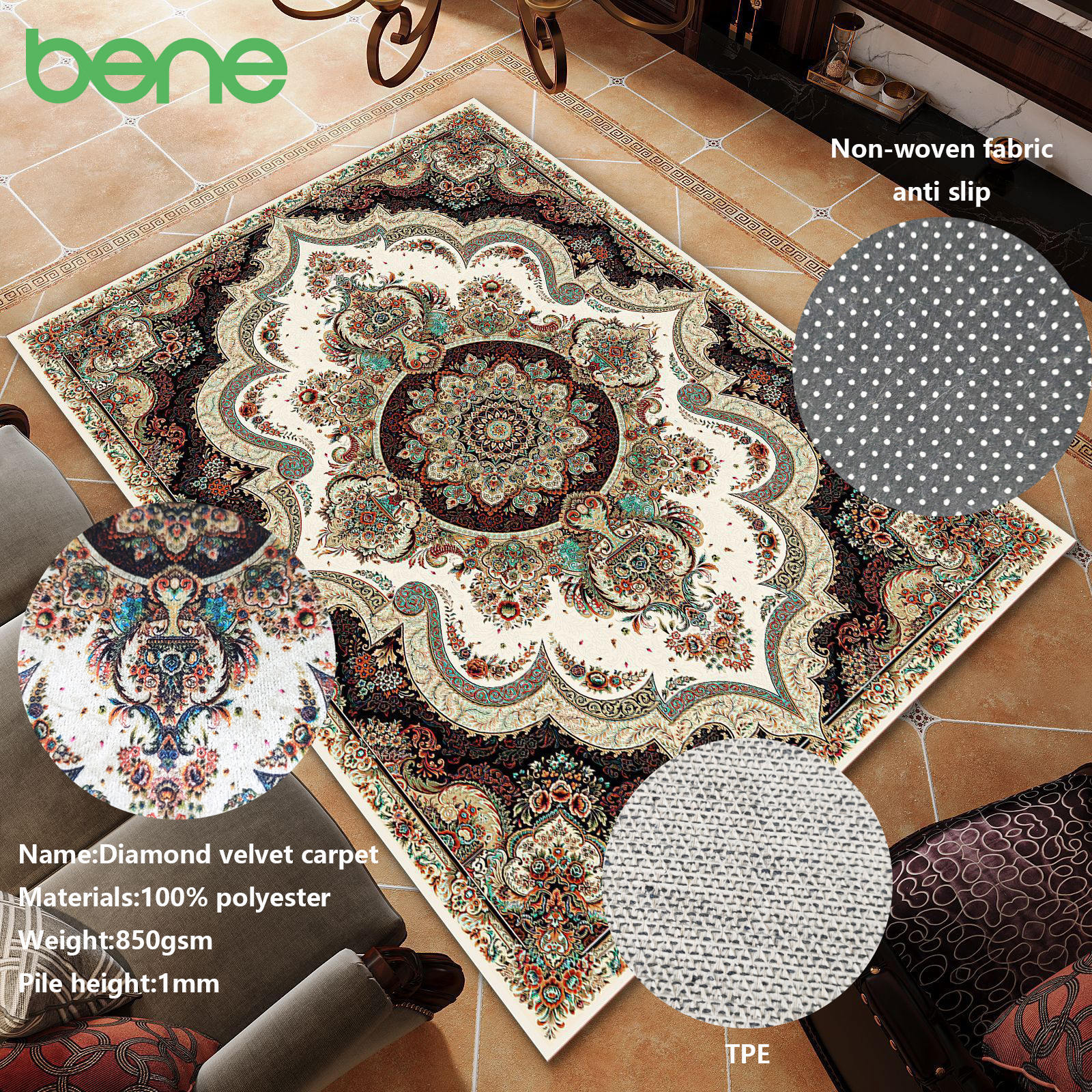 Syarikat kami mengkhususkan diri dalam permaidani, kain permaidani, dan produk siap. Dengan menggabungkan bahagian bawah dan permukaan, ia memecahkan mod pengeluaran tradisional kos pengeluaran yang tinggi dan kecekapan yang rendah dalam industri permaidani, menjadikan pengeluaran permaidani lebih mudah dan lebih cekap. Bene mempunyai kilang tenunan, pencelupan/percetakan sendiri, dan kilang pemprosesan permaidani selesai, membolehkan kami mengawal keseluruhan rantaian pengeluaran, menjaga kualiti dan masa yang baik. Dengan pasukan lebih daripada 20 jurutera kain, kami sedang membangunkan kain permaidani baru setiap suku tahun berdasarkan trend pasaran dan juga dapat menyediakan perkhidmatan yang disesuaikan mengikut keperluan pelanggan kami. Permaidani dan permaidani kami sesuai untuk pelbagai senario, termasuk ruang tamu, bilik tidur, bilik mandi, dapur, pintu masuk dan keluar, dan banyak lagi. Kami berbangga untuk menyediakan produk berkualiti tinggi dan perkhidmatan pelanggan yang cemerlang, dan matlamat kami adalah untuk menjadi pengeluar permaidani dan permaidani terkemuka di China dan juga di seluruh dunia. Kita juga boleh borong Tikar doa baldu berlian secara pukal. Kami mempunyai eksport di seluruh dunia._00.jpg)